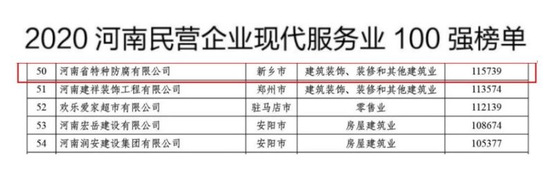 河南省特種防腐有限公司榮獲2020河南民營企業(yè)現(xiàn)代服務(wù)業(yè)100強
